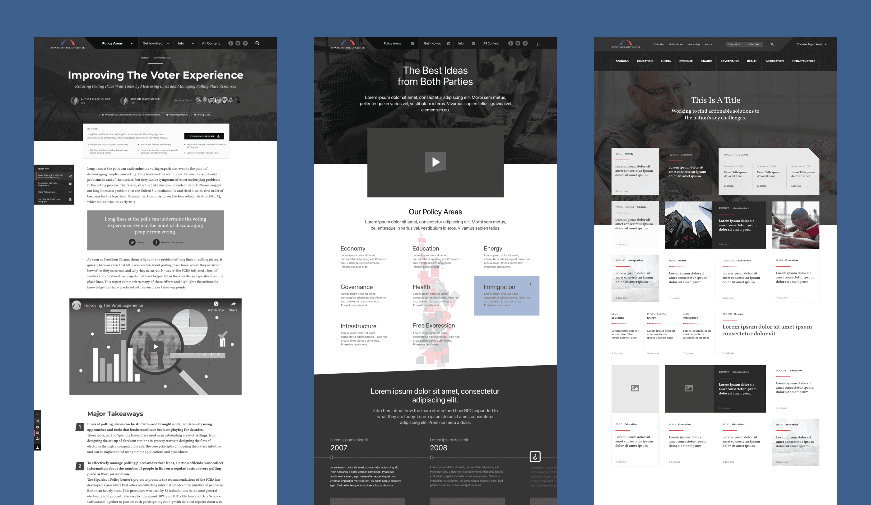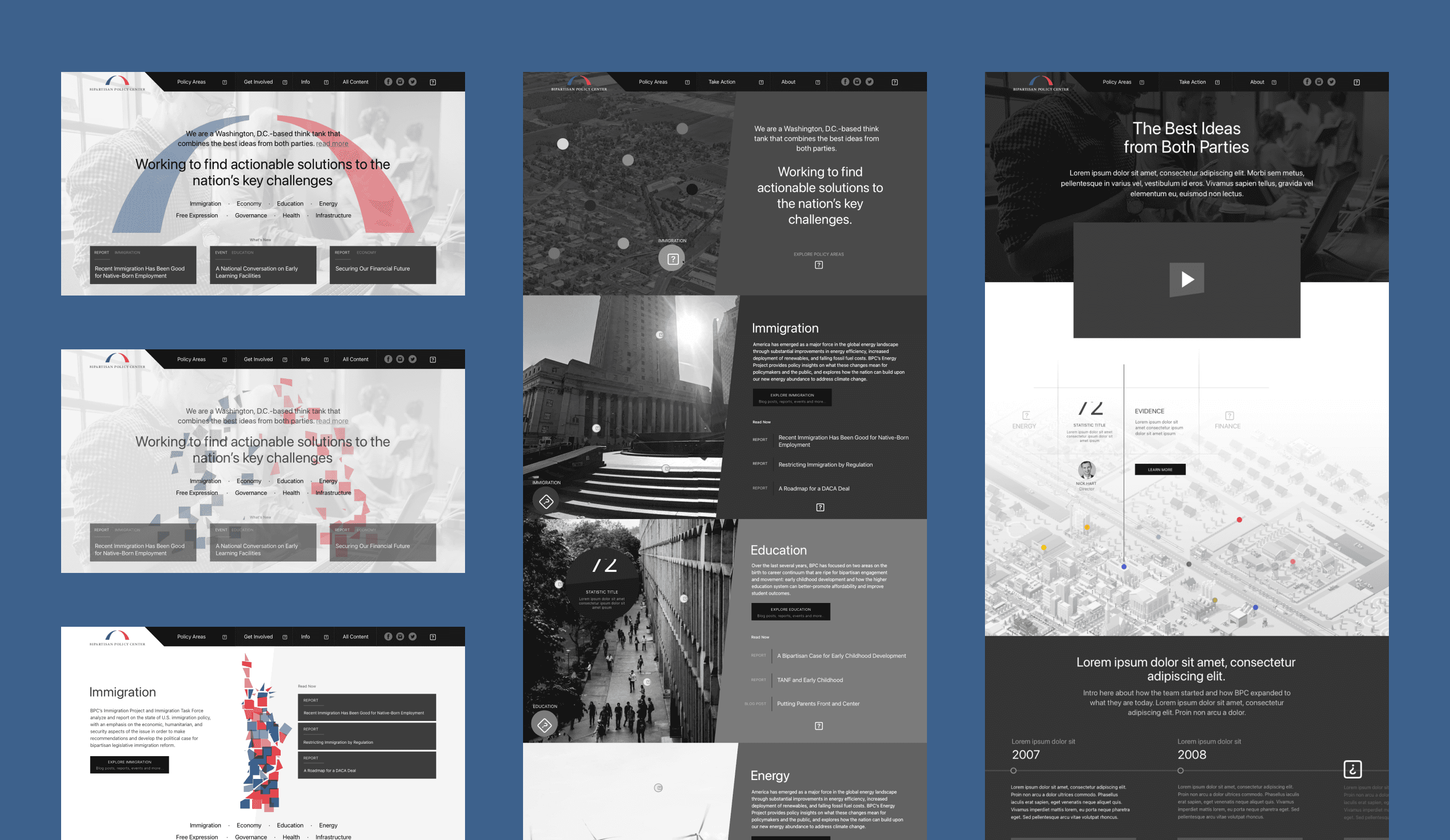 With an architecture in place, we moved to brainstorming approaches for the website experience. This exploration phase allowed me to quickly iterate on concepts and share with the BPC team for feedback. Ultimately, this moved us to an approved concept that I could extend to all pages of the site.