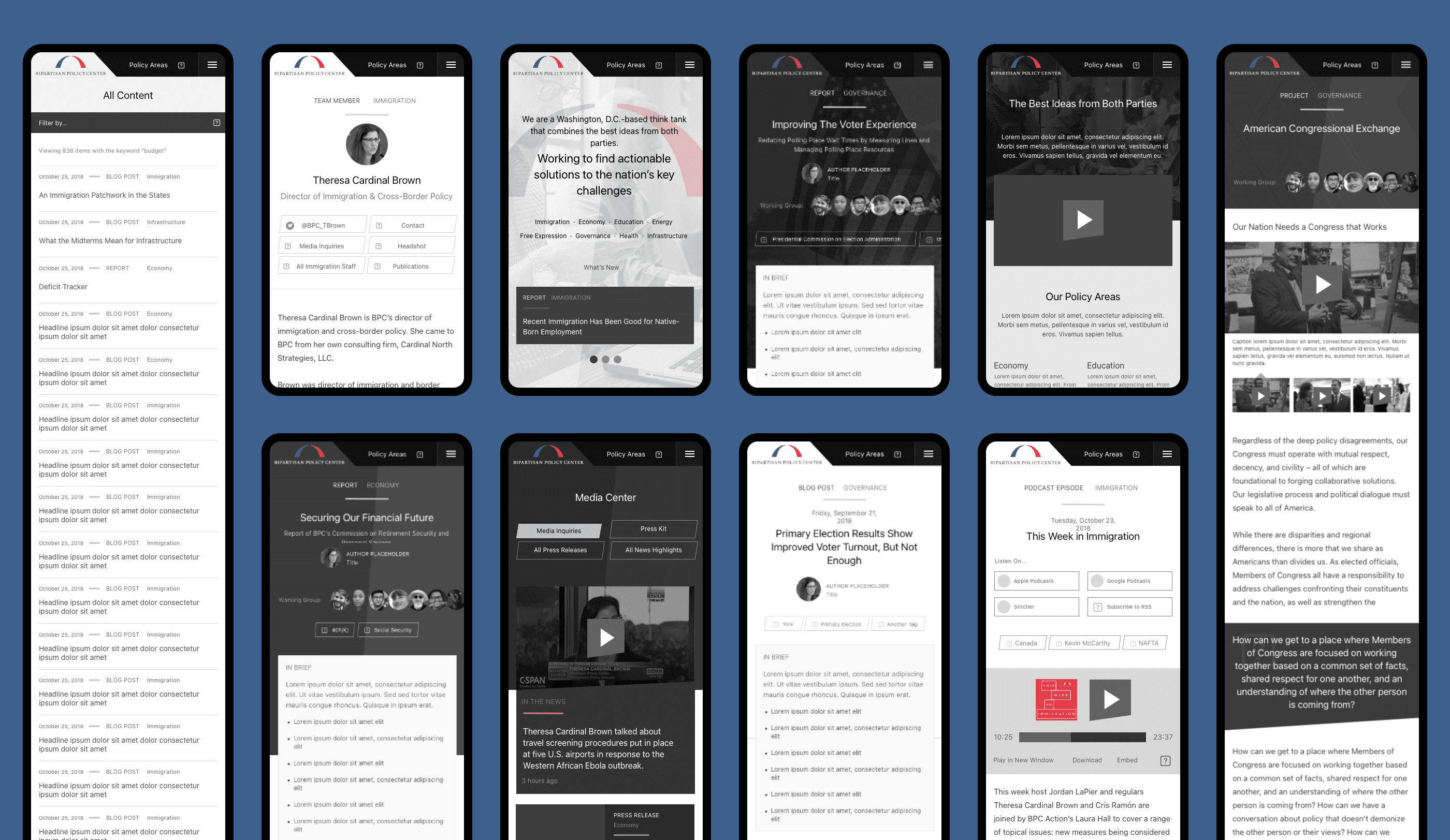 Finally, I prepared a full set of desktop and mobile wireframes, carrying the final approach through to the home page, policy areas, content archive, articles, calendar, team, podcasts and more. I then coordinated with the design team, who applied a new design system to the wireframes to set up the development of the site.