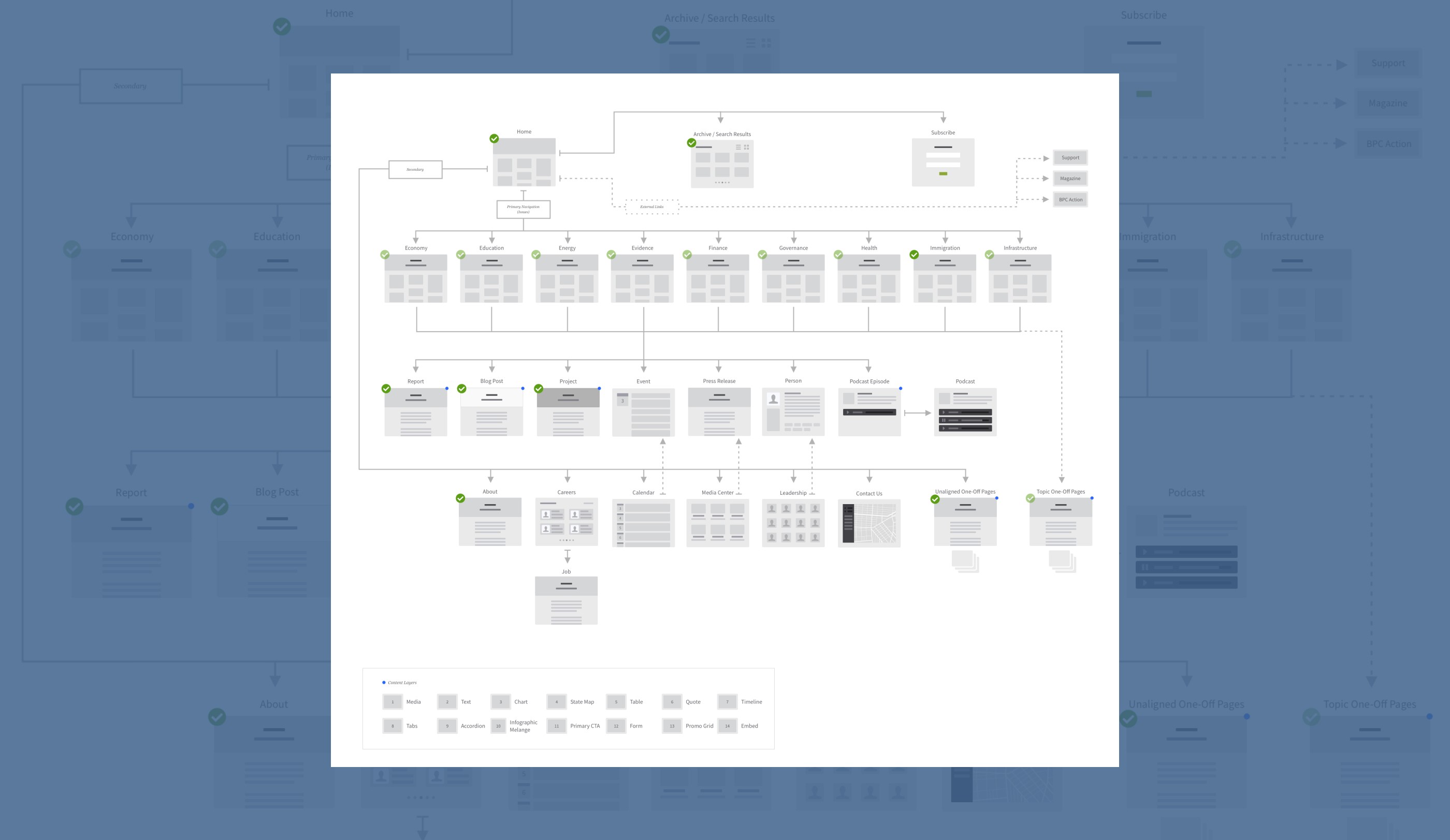 As a building block for the project, my work started with developing the architecture and flow for the website redesign. After gaining a deep understanding of the content and messaging for BPC, I created and presented multiple approaches. This guiding document got designers, developers and client stakeholders on the same page, allowing us to move forward with confidence.