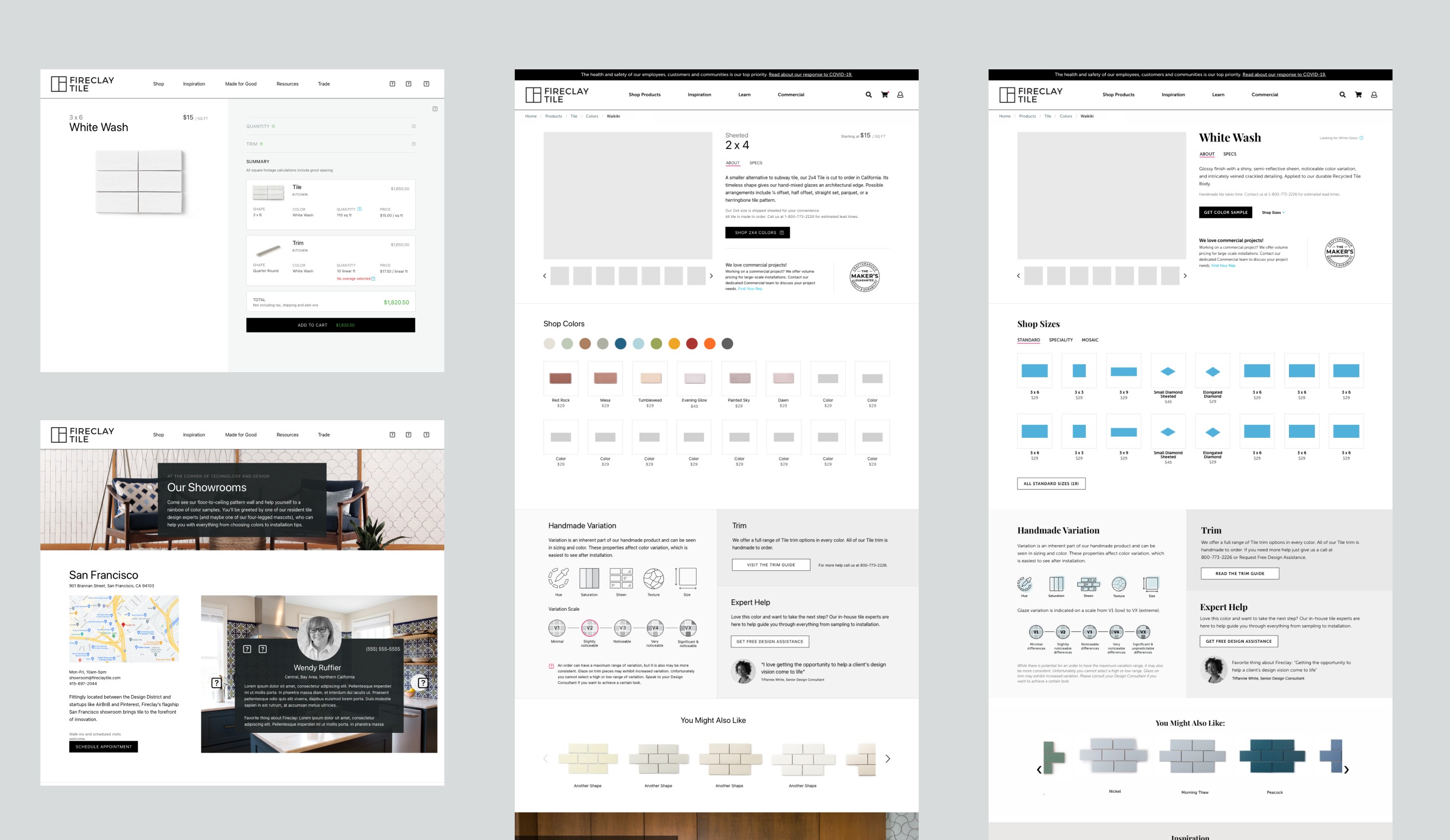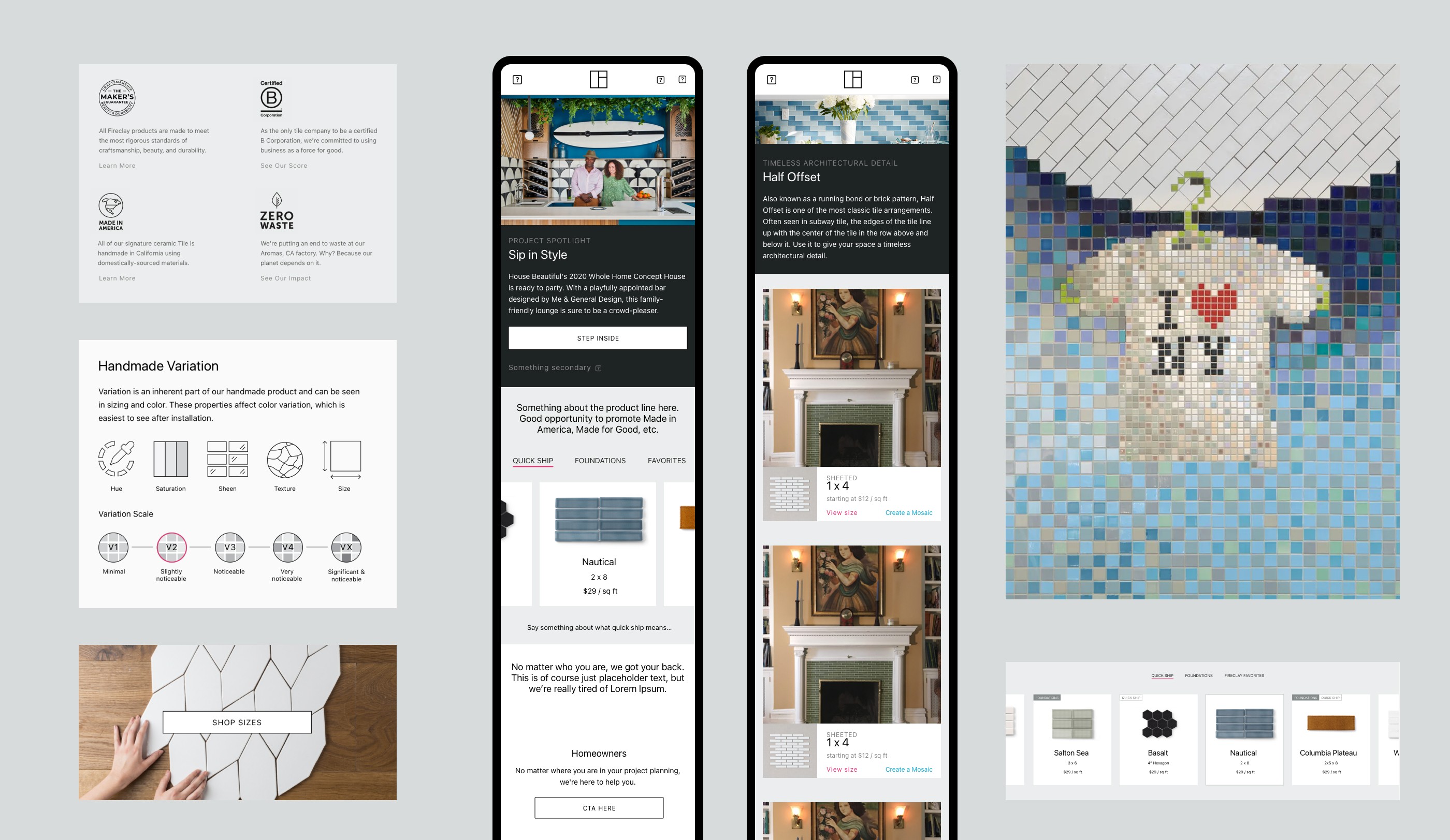 With concepts in hand, I moved to mockups that would best facilitate development: a mix of fully polished design files, wireframes and components. This led to new experiences and design for the home page, collections, a variety of product page types, inspiration galleries, resources, search, plus a design system that could extend to other areas. I also completed an extensive review and redesign of the checkout process. For a tile company, this meant more than many e-commerce experiences. Square footage and quantity calculations, warranties, home renovation projects that included multiple products, and the mobile UX all had to be factored in.