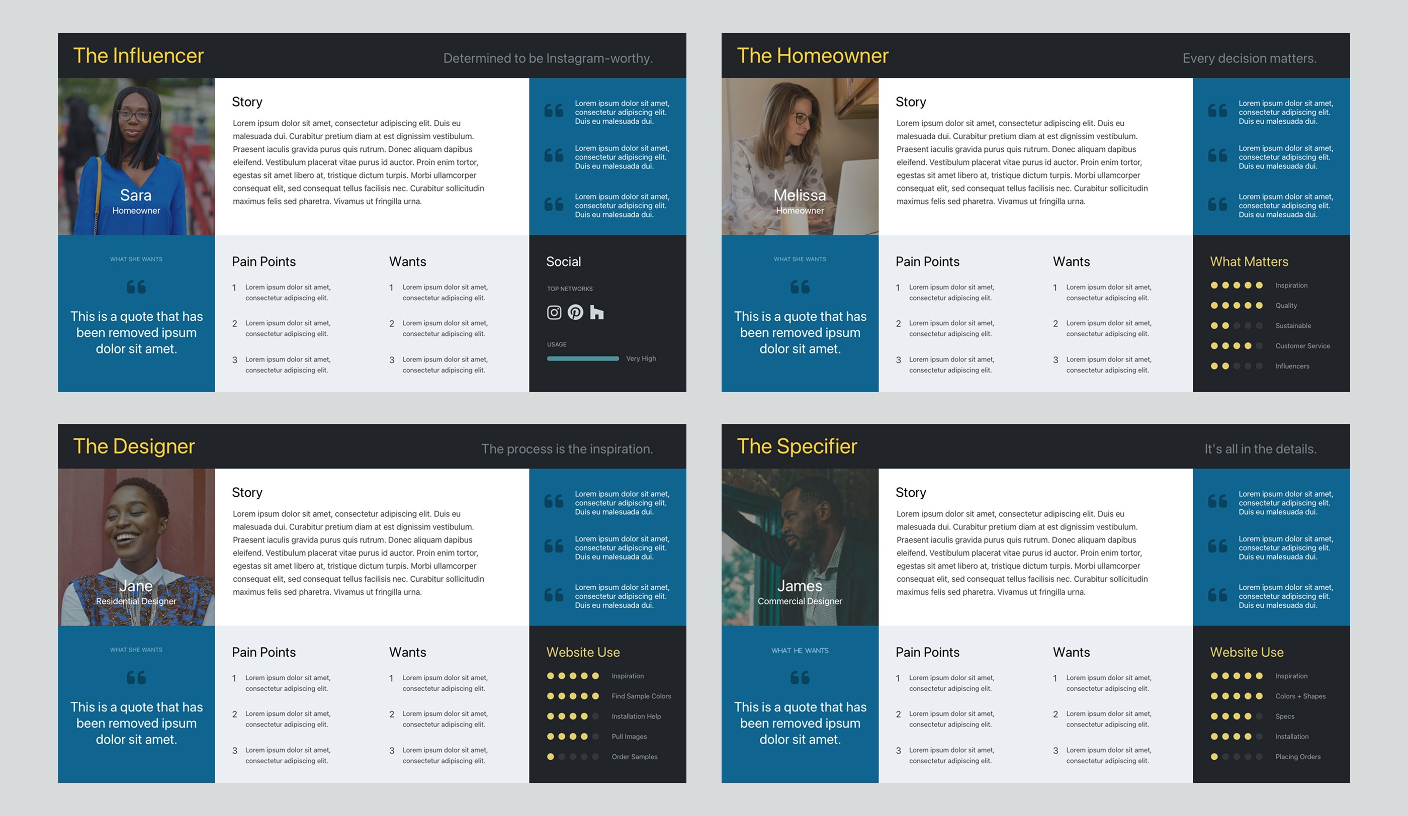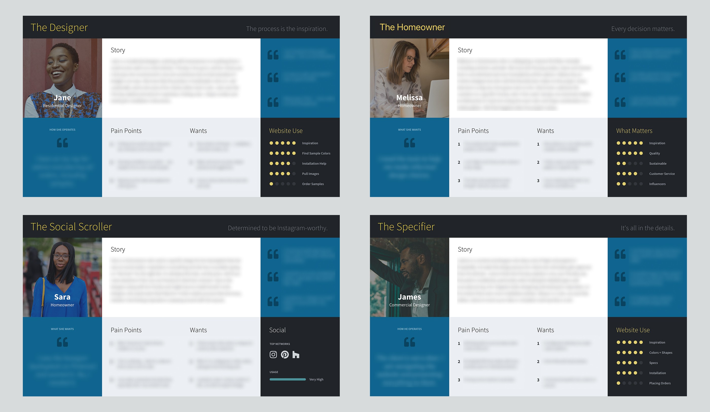 In order to determine what to prioritize in the ongoing work, I first completed an in-depth discovery. This included conducting interviews with Fireclay customers and staff and surveys to reach a broader audience. I also reviewed competitors, existing documentation, product specs and email campaigns to gain a full understanding of the industry and Fireclay's current offerings. The result of this discovery was the identifcation of several themes that would guide all work, the development of user personas to keep the work grounded in customer realities, and concrete actions and concepts to begin UX and design. I also confirmed through this discovery that the plan for incremental changes, and not a full redesign, was the right approach.