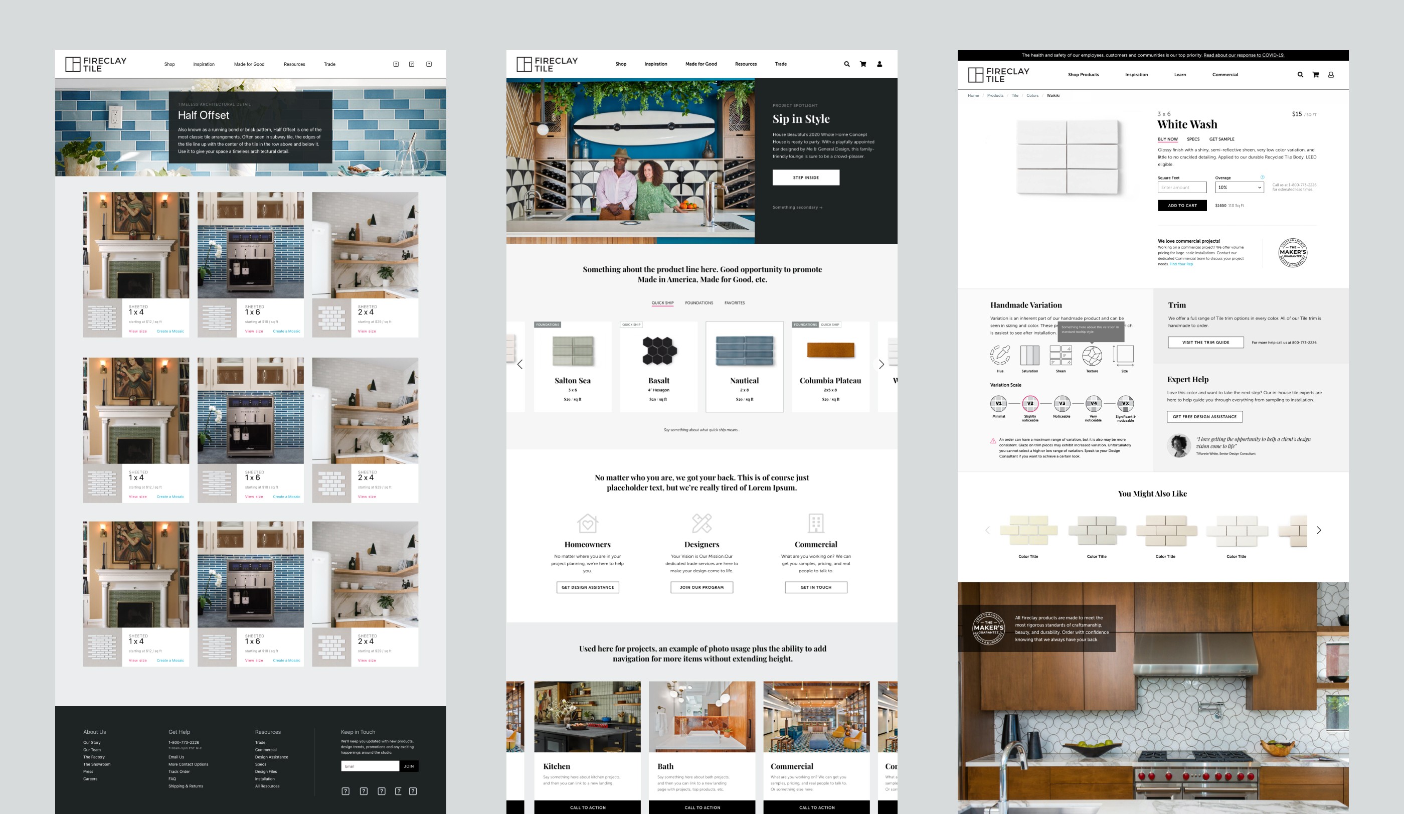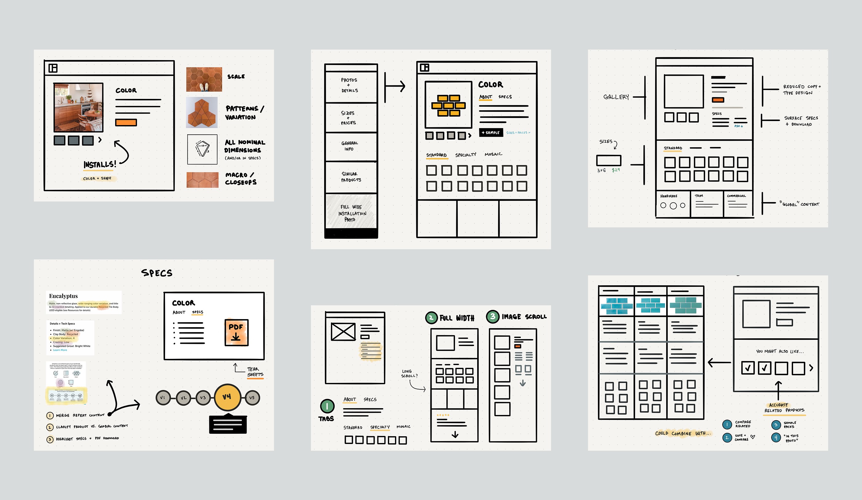 With our goal of ongoing updates in mind, I took the approach of using digital markup and sketches to quickly get approval on concepts. This started with a new approach to the overall navigation and flow of the site. Then, based on the priorites set in discovery, I tackled specific areas or pages one at a time, presenting ideas to both the Fireclay team and the developers. This allowed us all to move forward confidently with design.
