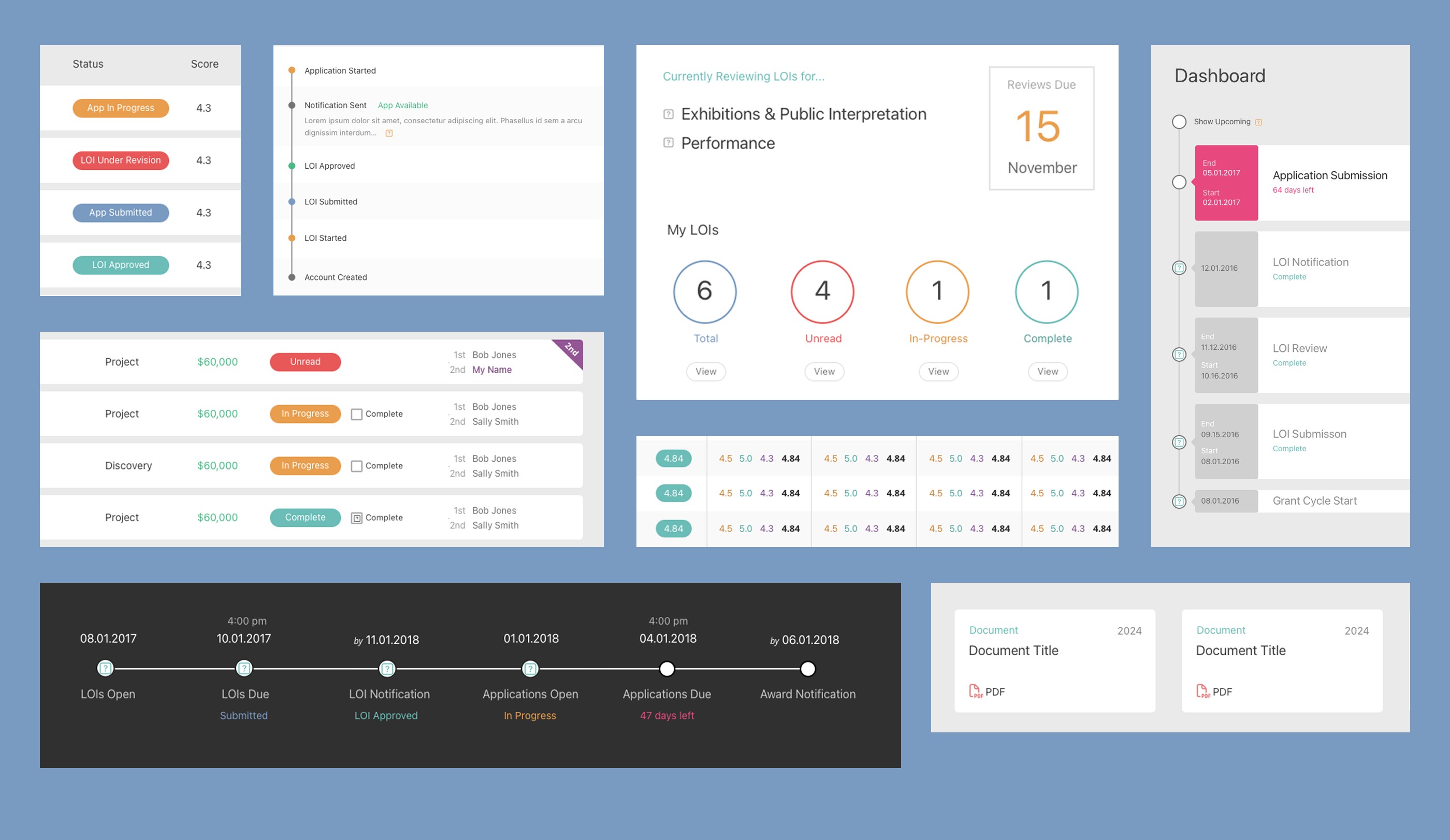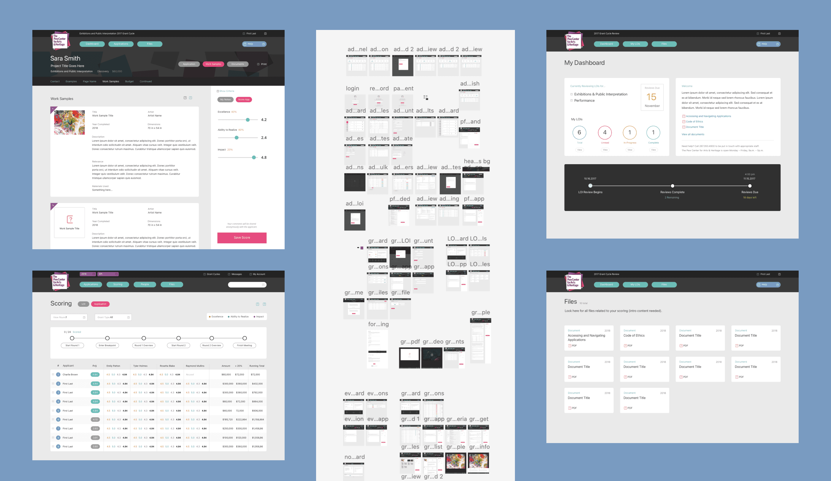 The platform required a large and diverse set of screens: applicant dashboards, multi-step applications, evaluator scoring views, live group judging interfaces, administrative tools, messaging systems, timelines, and asset management for creative submissions. I presented wireframes of all screens, allowing us to test each audience's experience before moving to design. Visual design built on the Pew Center’s existing identity, prioritizing clarity, hierarchy, and ease of use over decoration. Tables, search, filters, and data-dense views were carefully designed to support review sessions and decision-making.