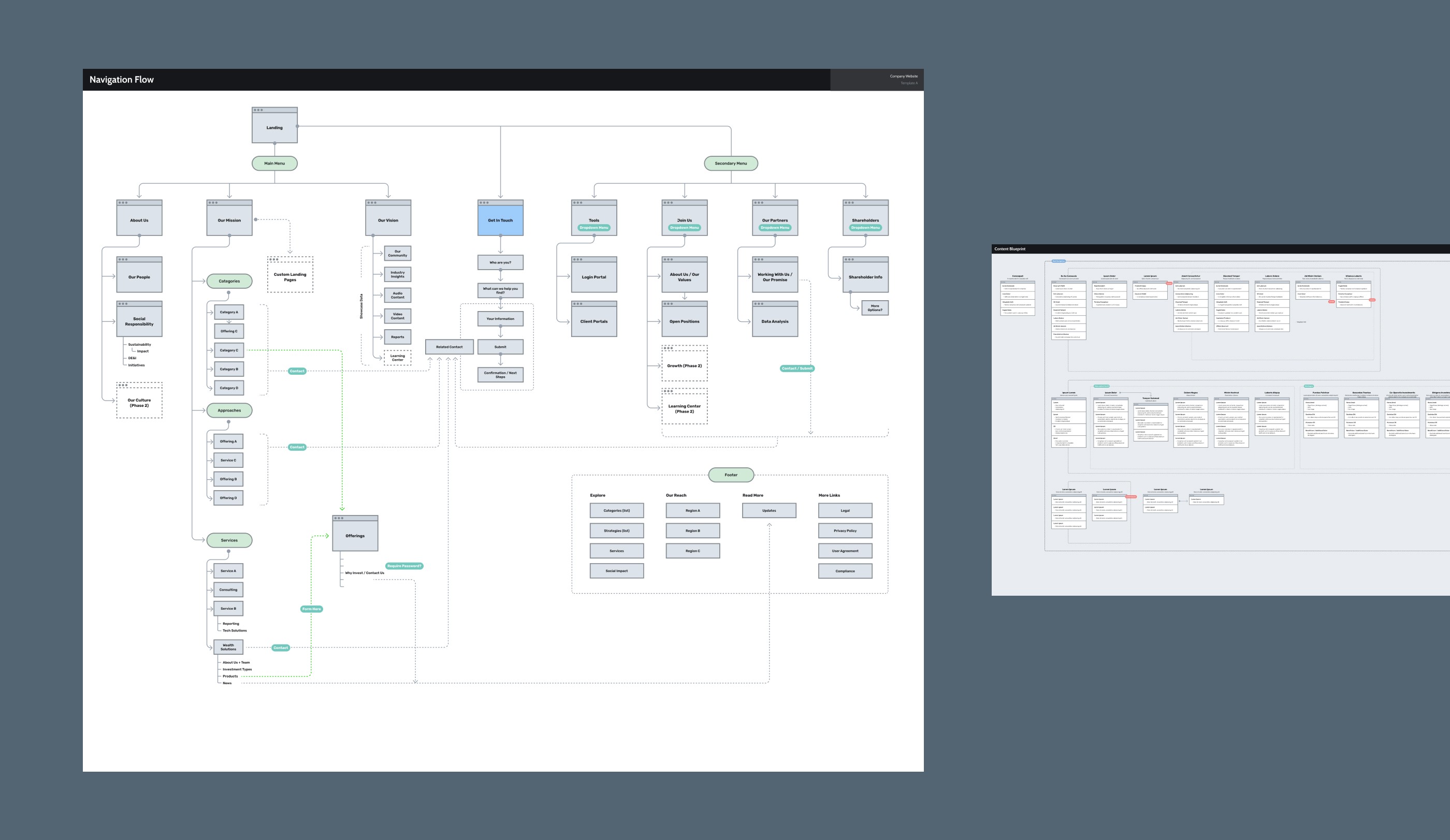 With a clear understanding of users and goals, I developed a comprehensive sitemap demonstrating the information architecture that organized StepStone’s offerings into intuitive, logical paths. I paired this with a content blueprint, mapping what content belongs on each page, why it’s there, and how it supports both user needs and business objectives. This process helped align stakeholders and ensured the site could scale as content evolves.